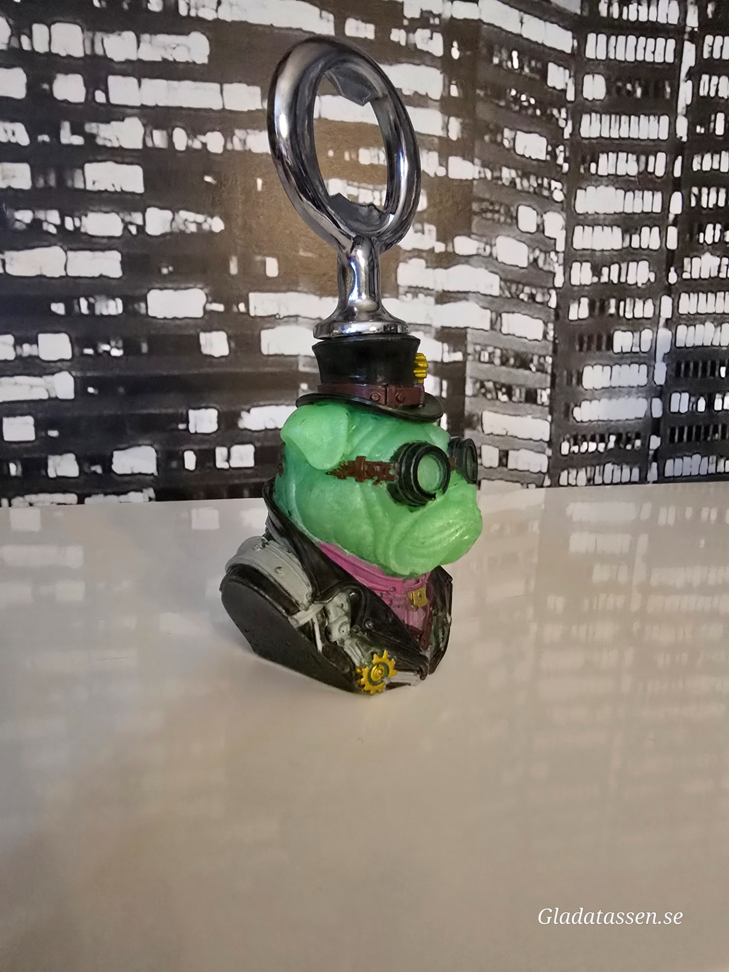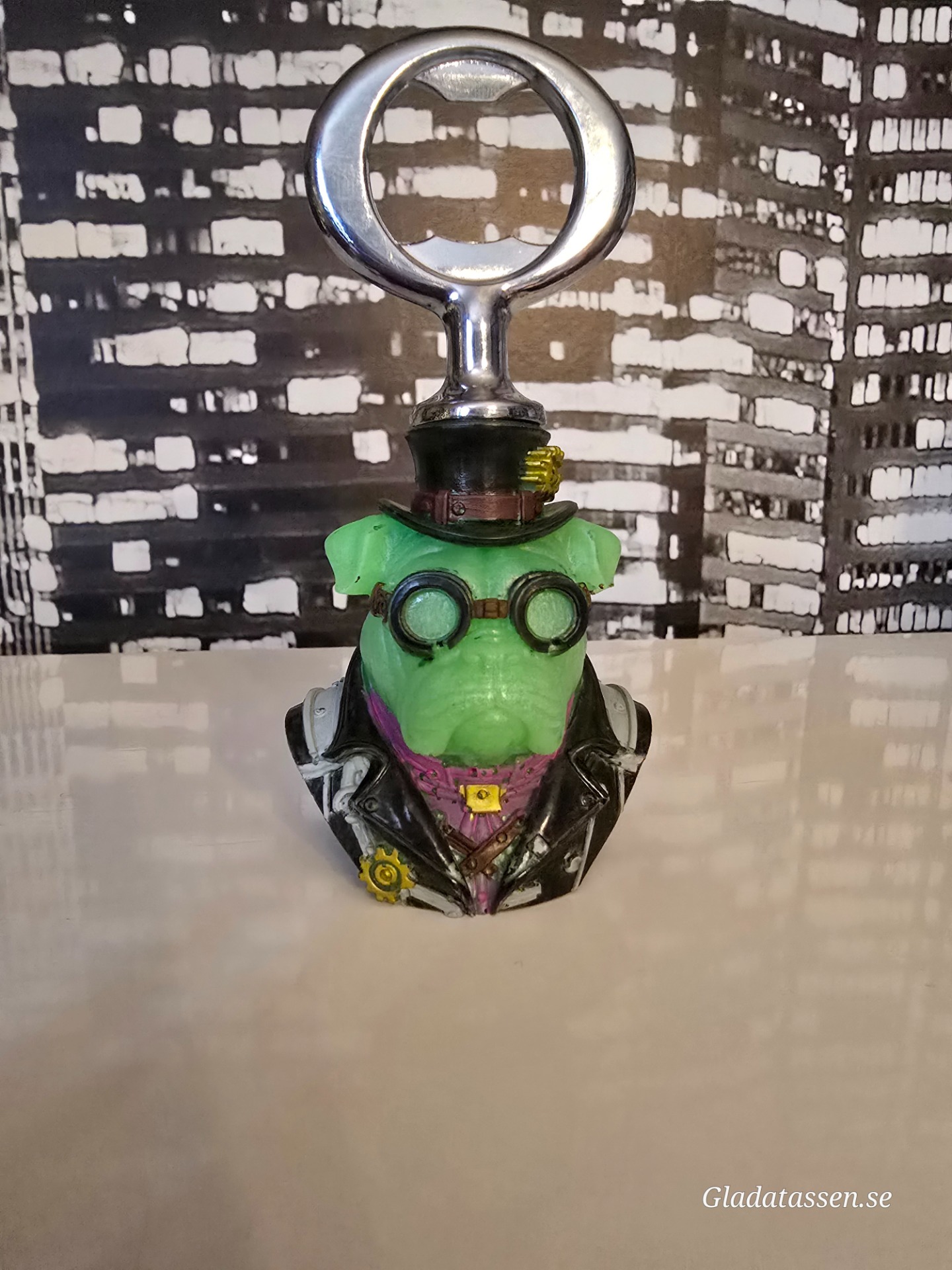 Finish: Detaljrik design med fokus på metalliska kugghjul, läderstruktur och de ikoniska gröna glasögonen.