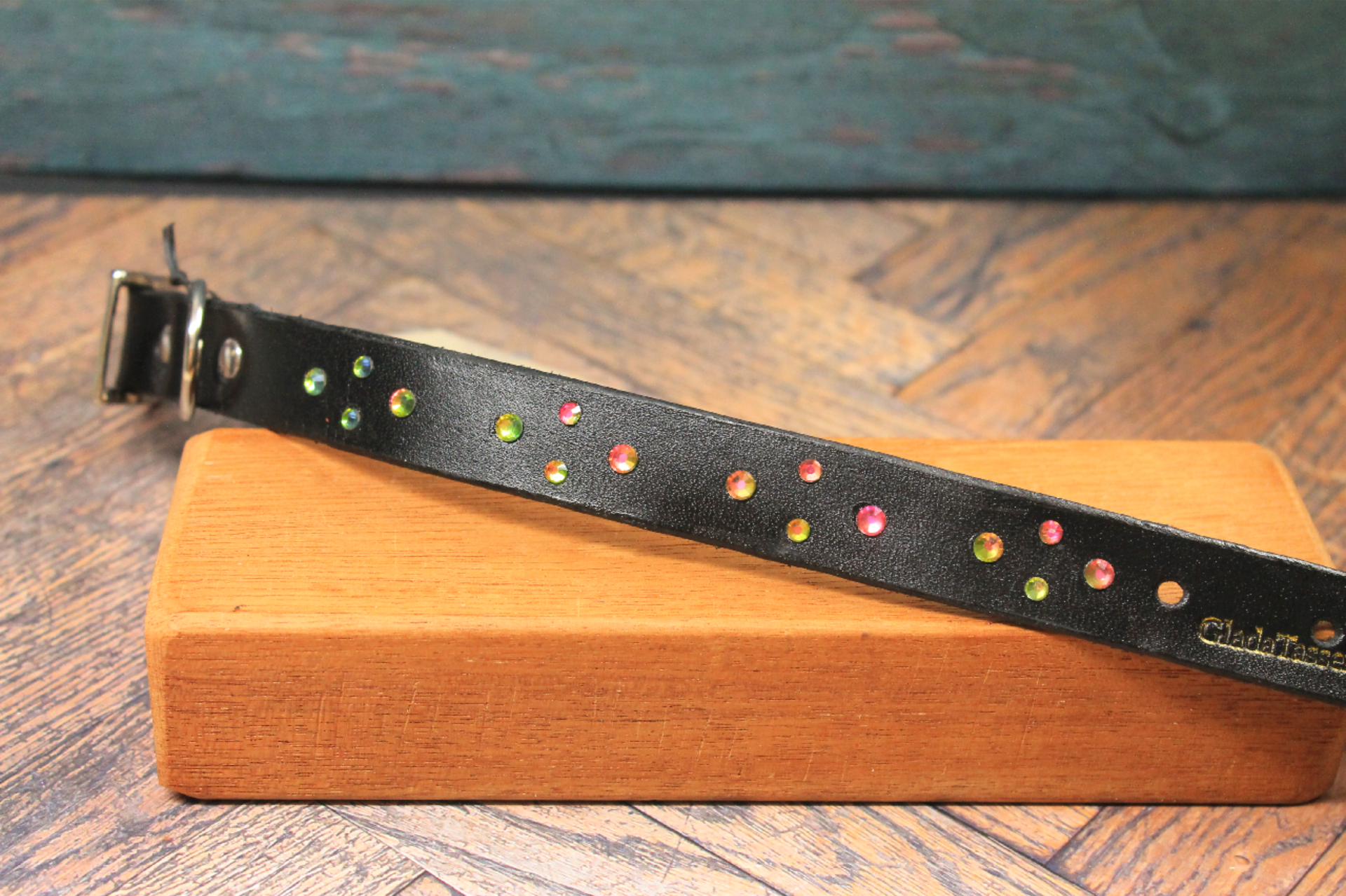 - Färg: Svart kvalitetsläder med multifärgade strassnitar.