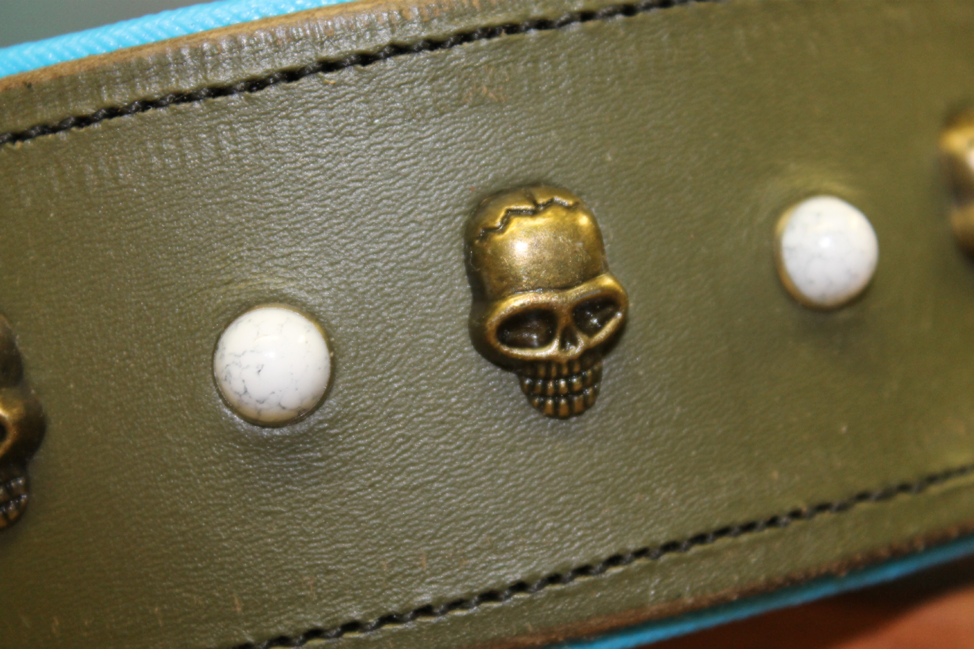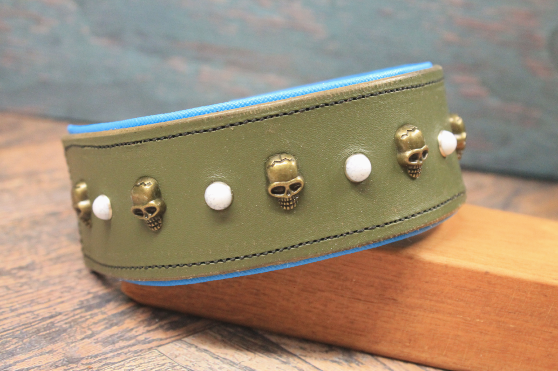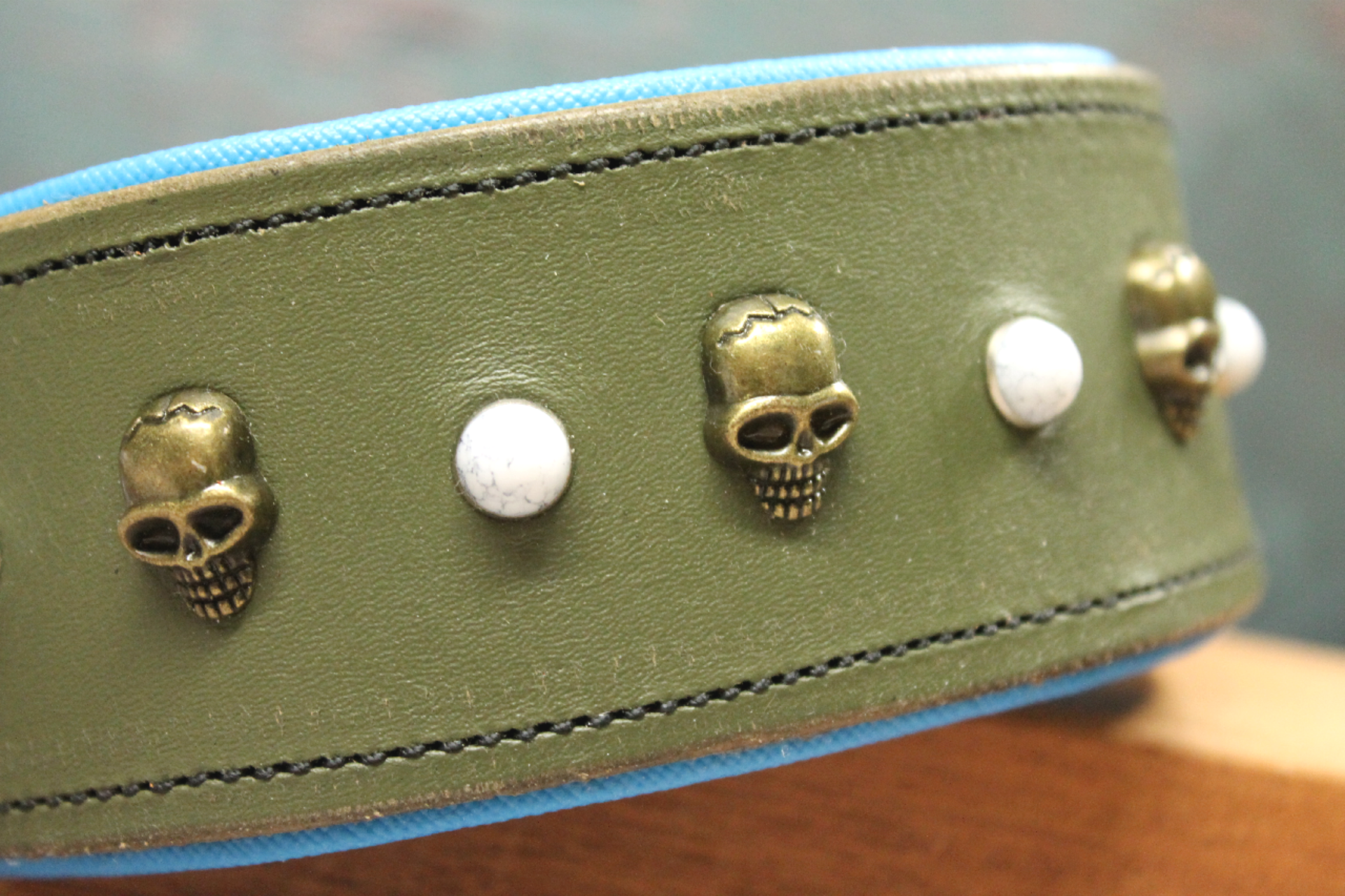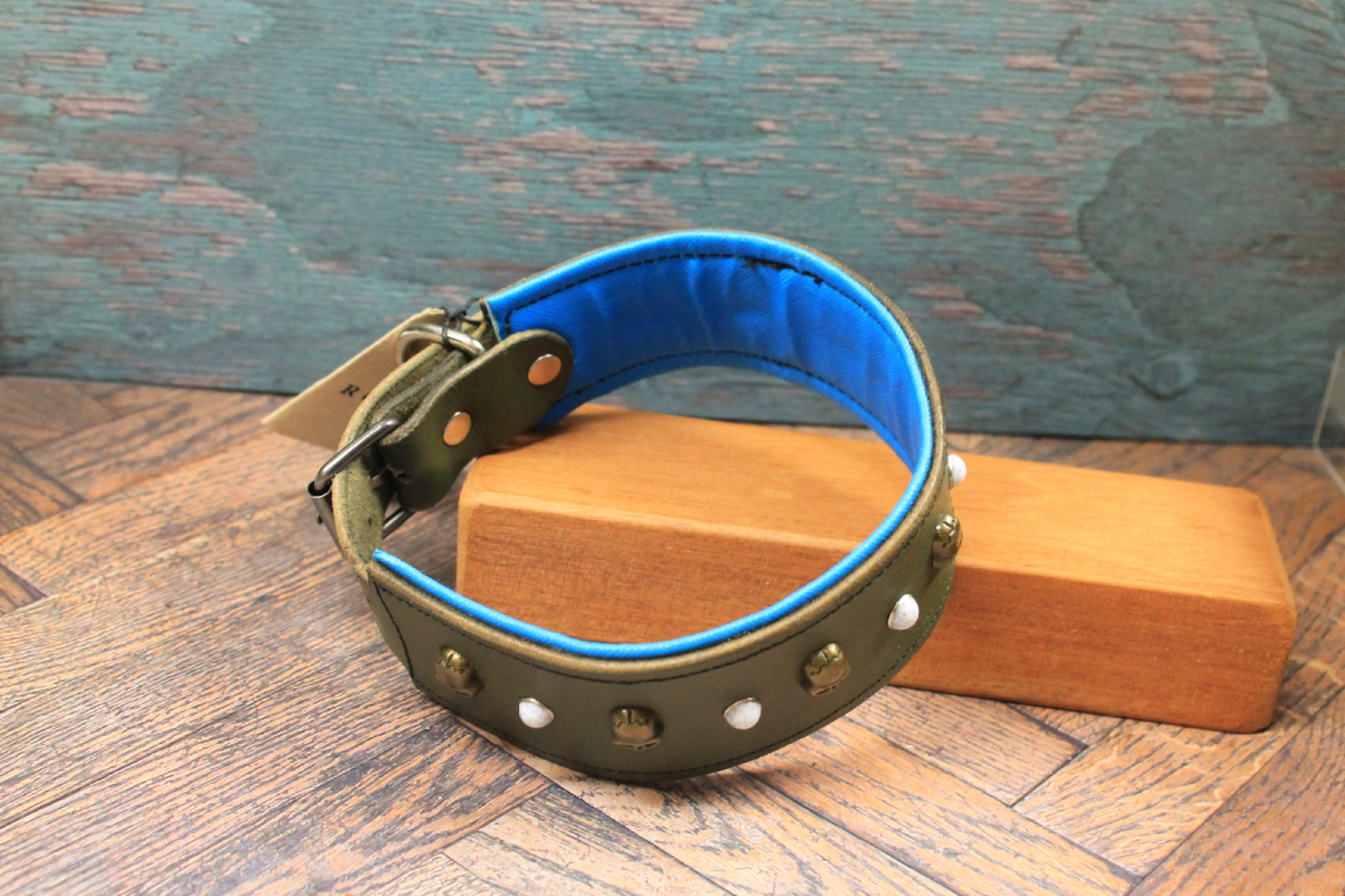 Halsbandet är byggt på en bas av robust, mossgrönt kvalitetsläder som ger en hållbar och rustik känsla.