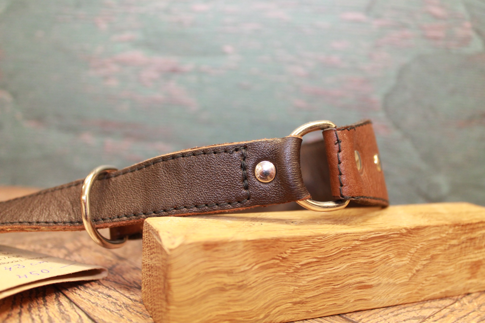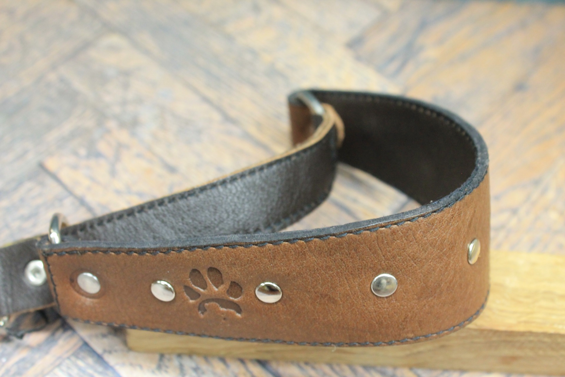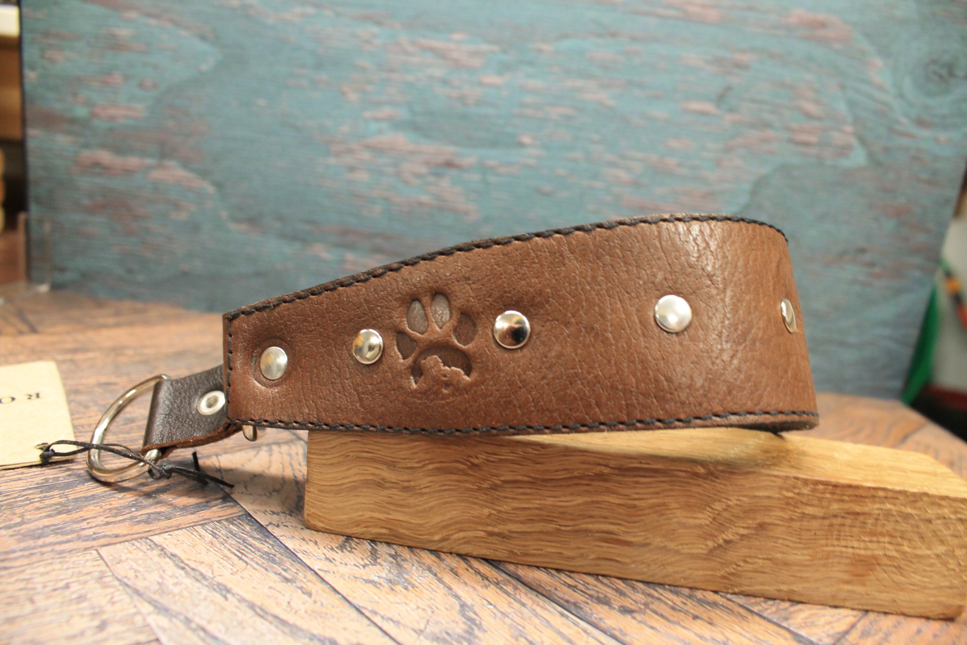 Det här halsbandet är skapat för att hålla. Det kraftiga, bruna lädret har en vacker naturlig ådring som bara blir snyggare och får mer karaktär ju mer det används. De jämnt placerade silvernitarna ger en diskret men bestämd kontrast som för tankarna till klassiskt sadelmakeri.
