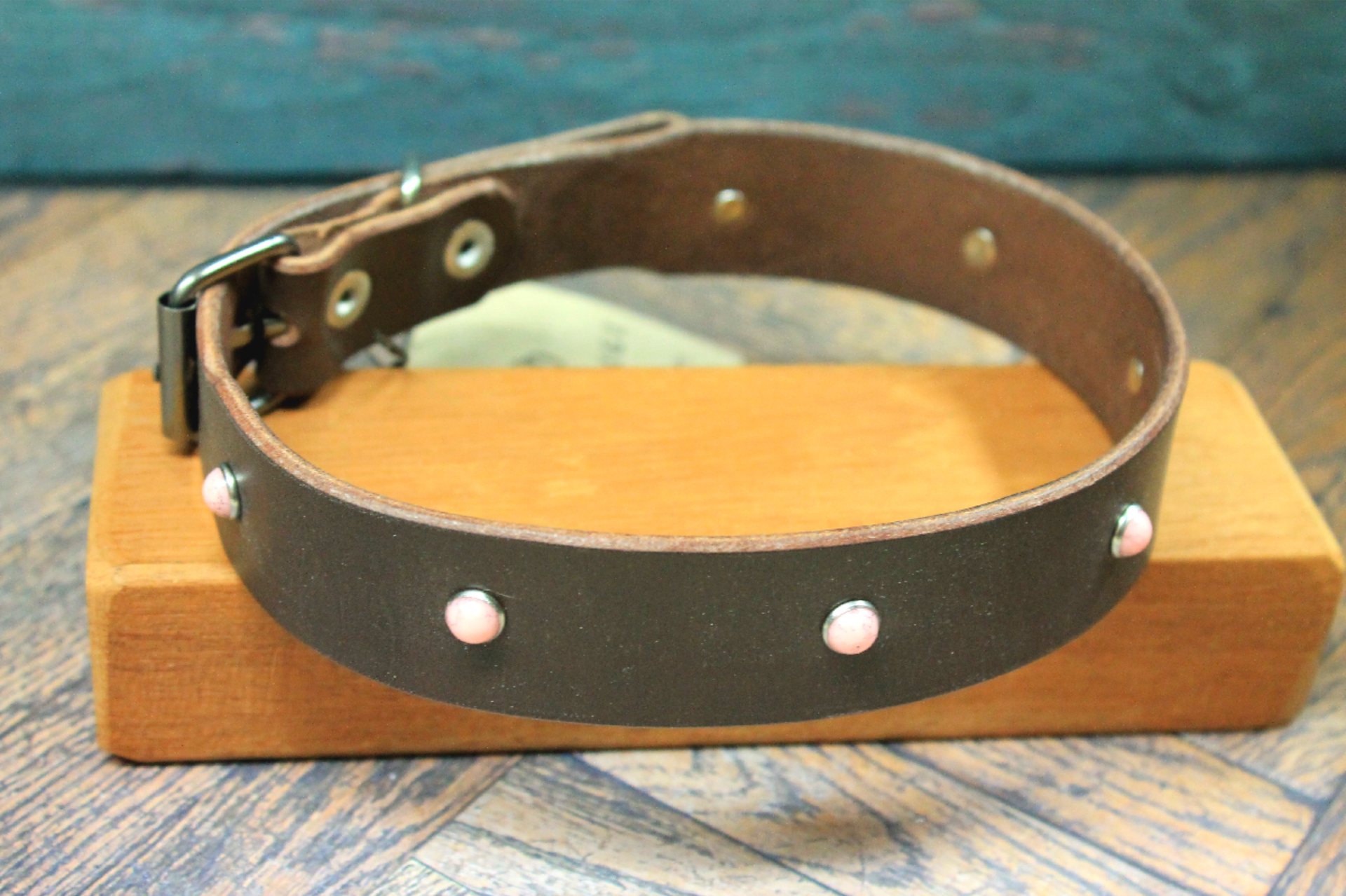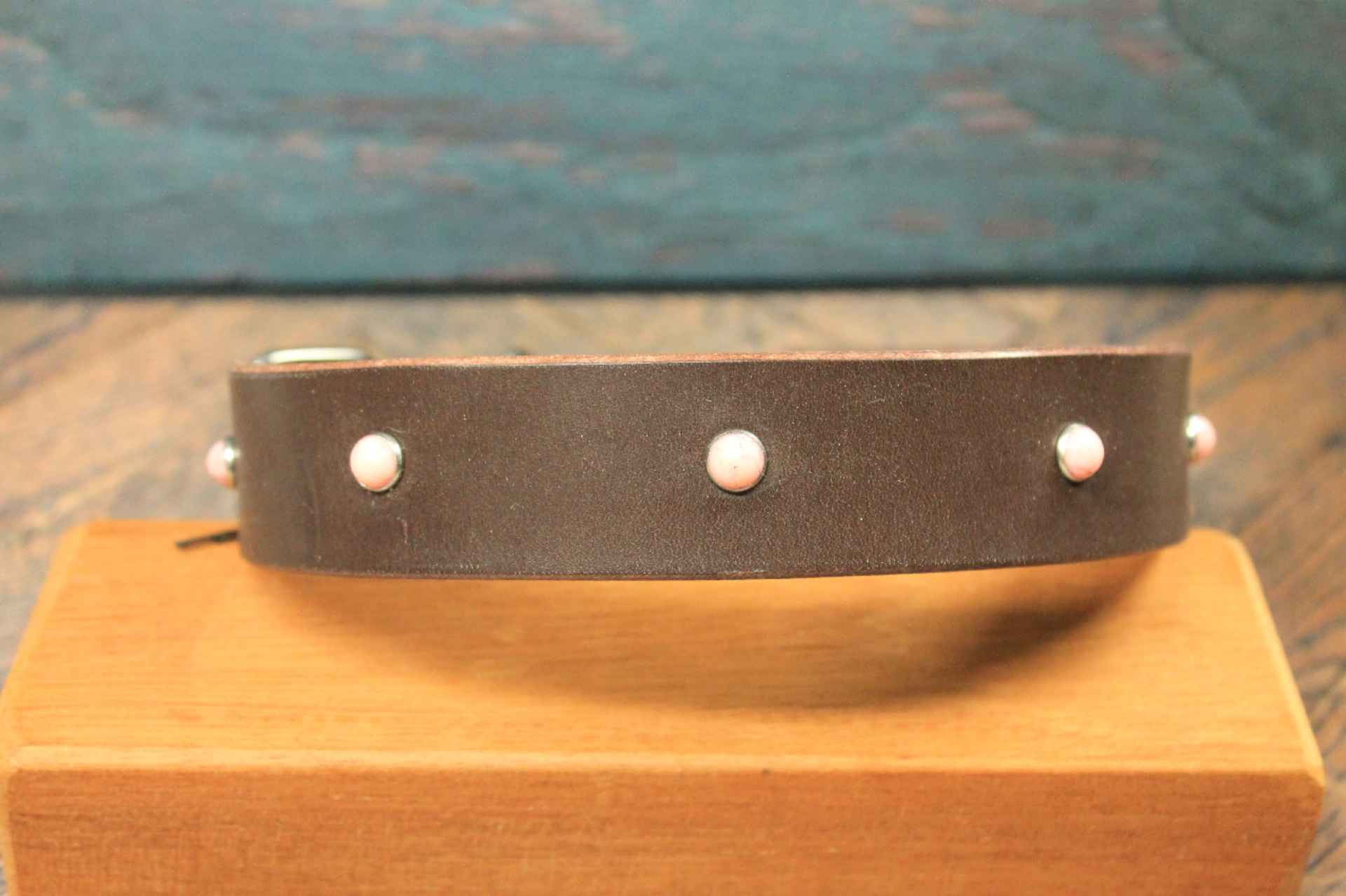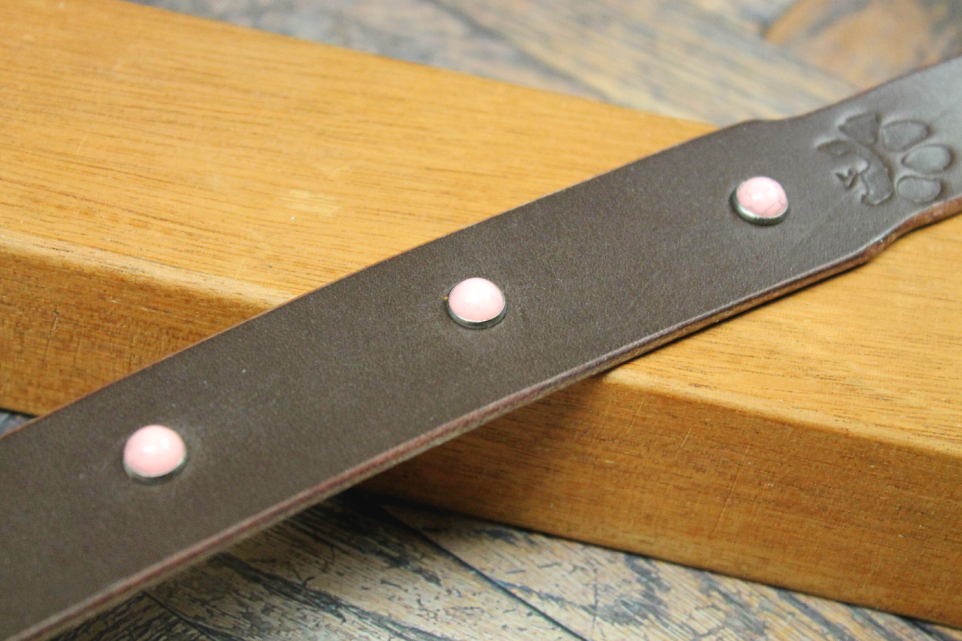 Hjortronblom är halsbandet för dig som uppskattar den klassiska, jordnära stilen men vill addera en mjuk och exklusiv detalj. Med sin rika, mörkbruna läderbas och sina noggrant infattade nitar i rosa marmor, skapas en tidlös design som är lika vacker på fjällvandringen som på stadspromenaden.