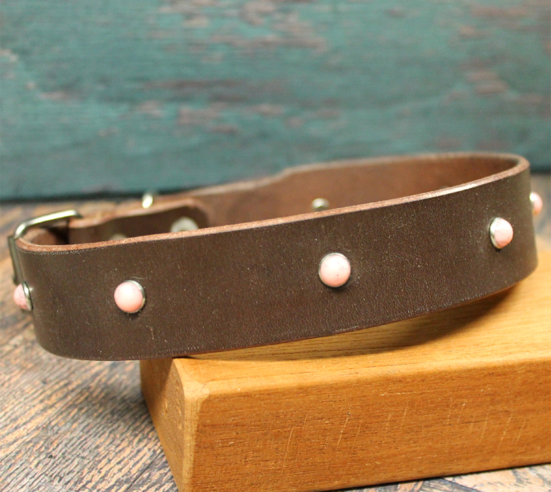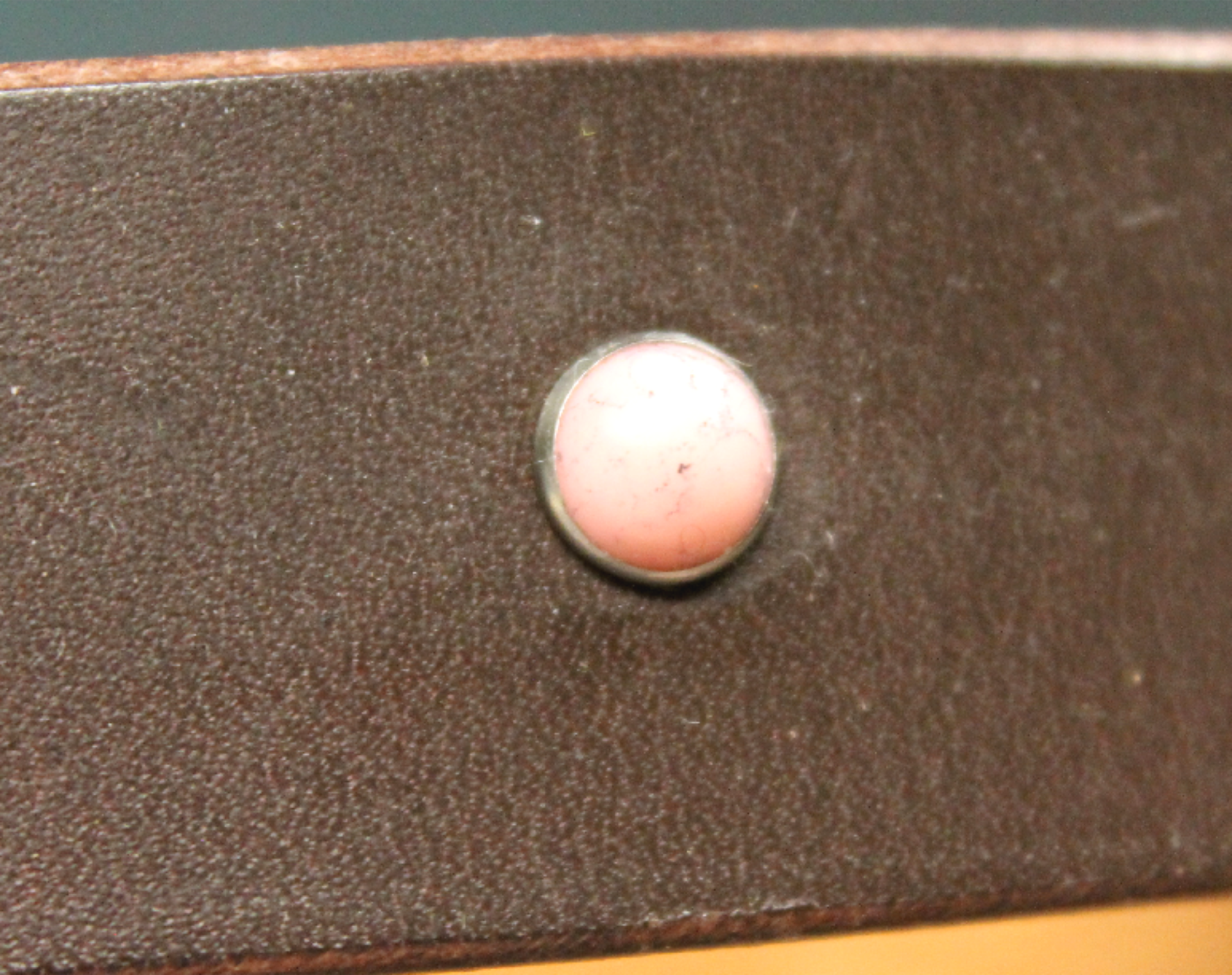 - Färg: Rustikt brunt läder med nitar i rosa marmor.