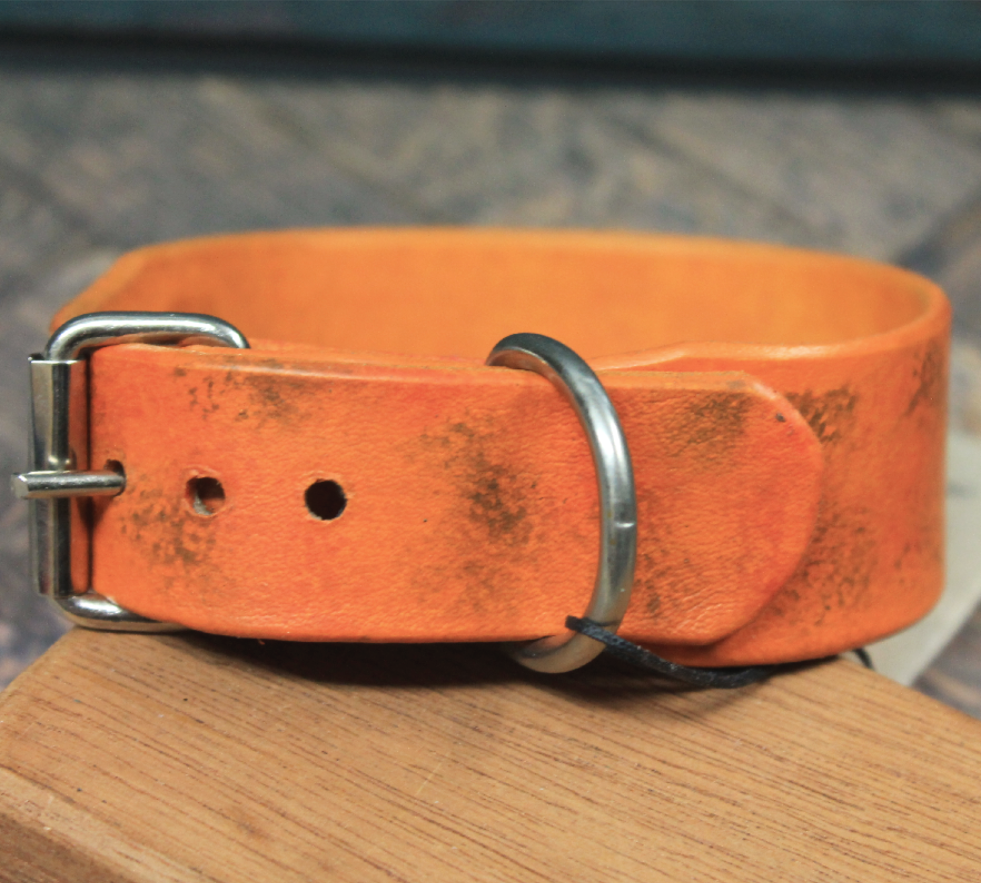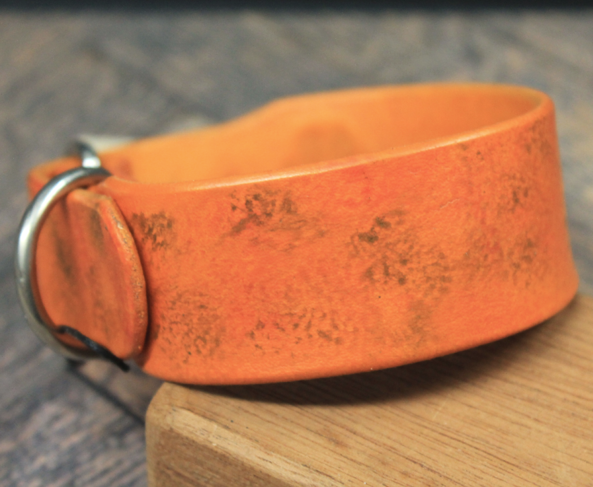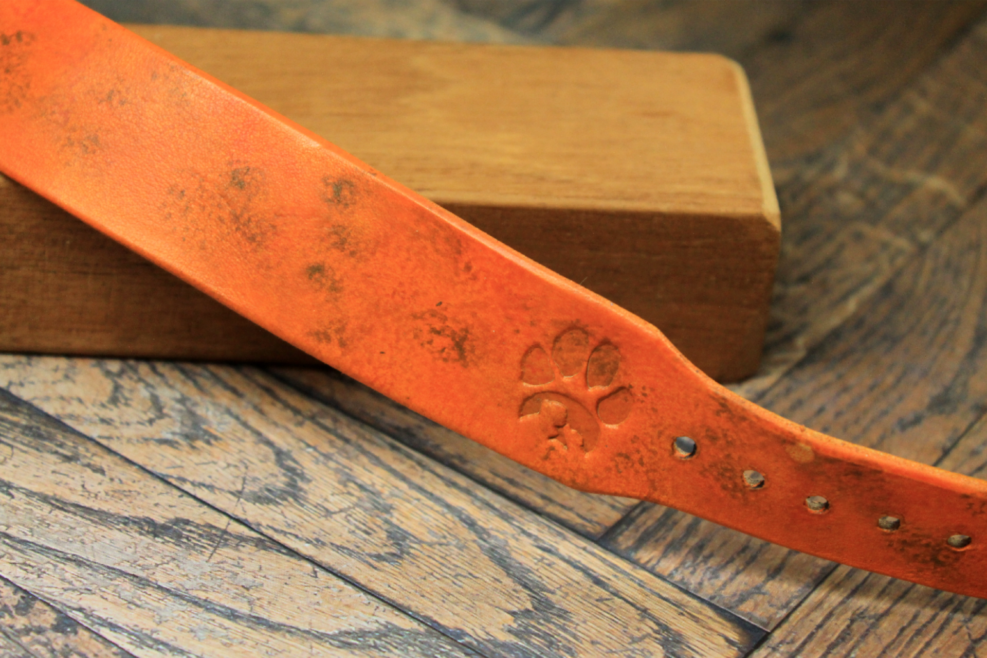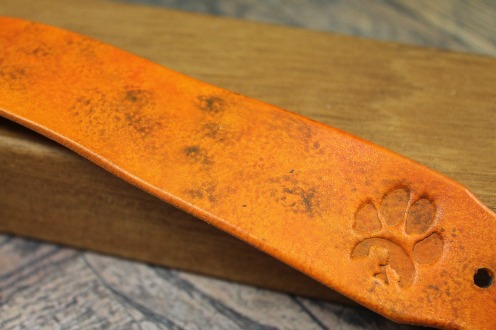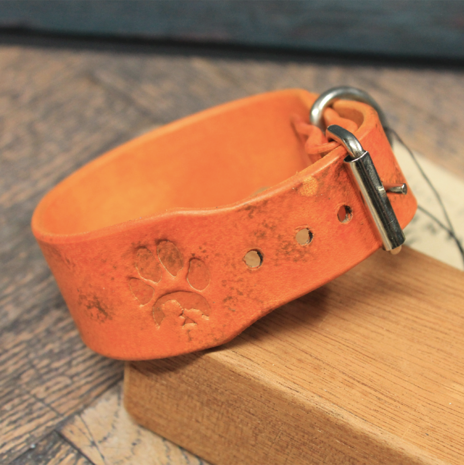 Halsbandet är handmålat med omsorgsfullt utvalda läderfärger för att skapa en djup och levande lyster. Den flammiga och naturliga ytan ger lädret en fantastisk karaktär och gör att varje halsband får sitt eget unika uttryck. Som en signatur för vårt hantverk bär halsbandet ett djupt präglat tassavtryck – en symbol för kärleken till våra fyrbenta vänner.