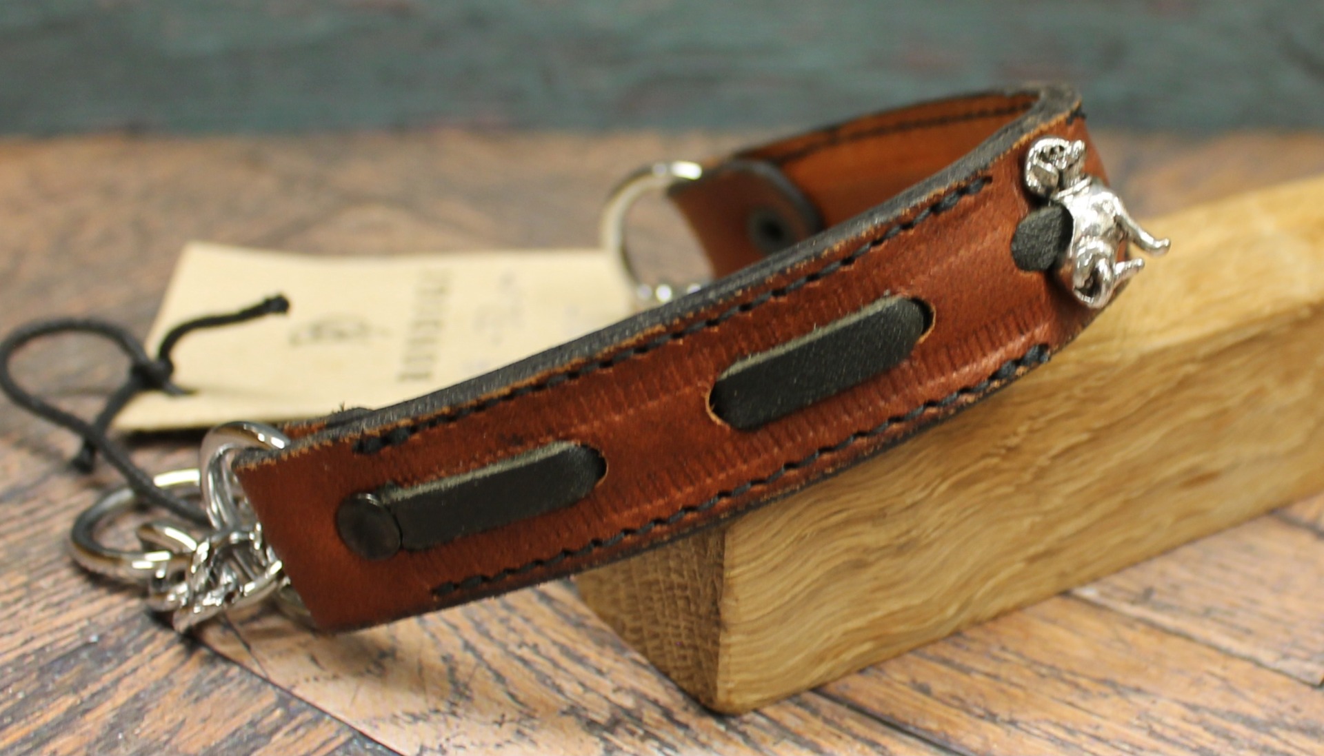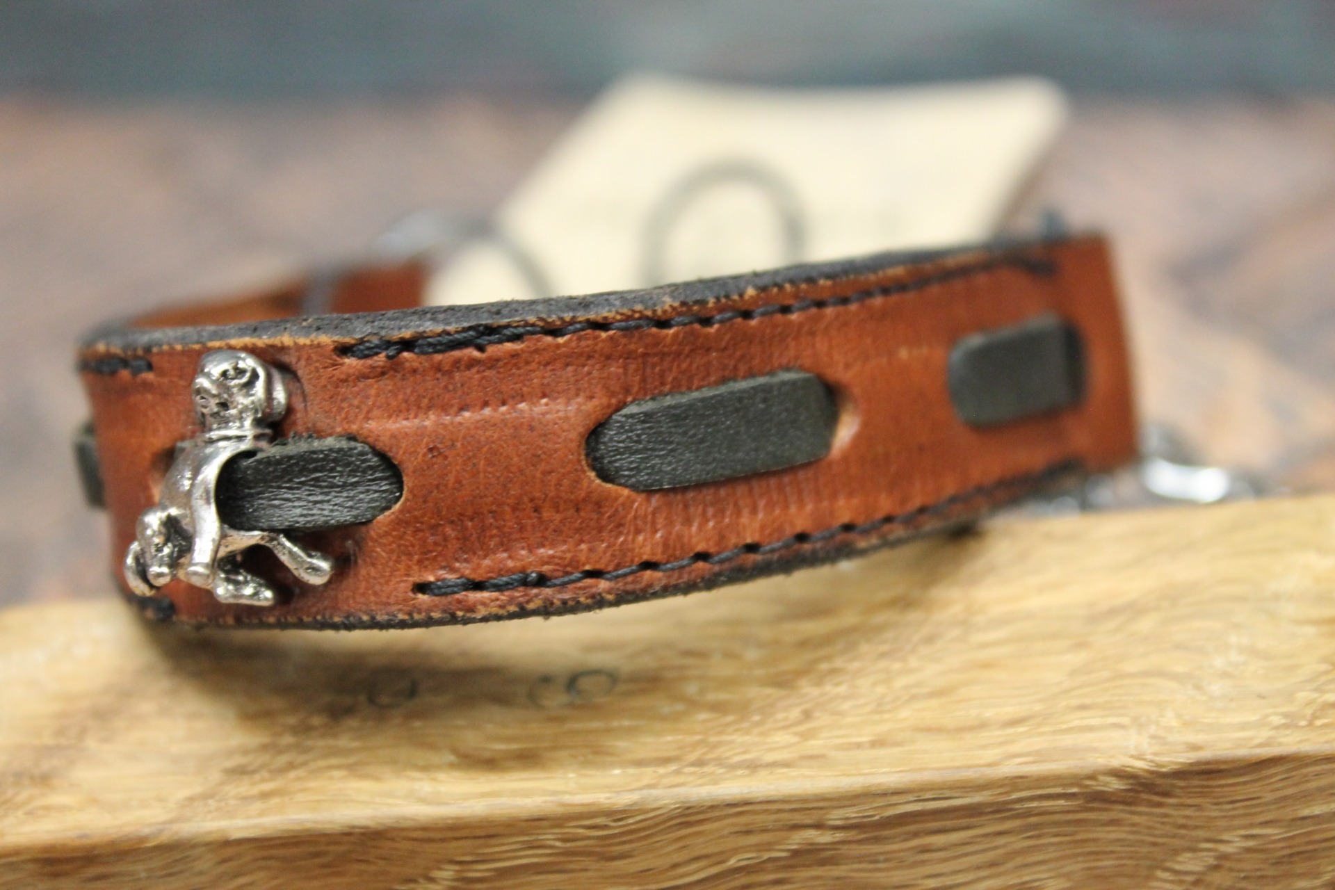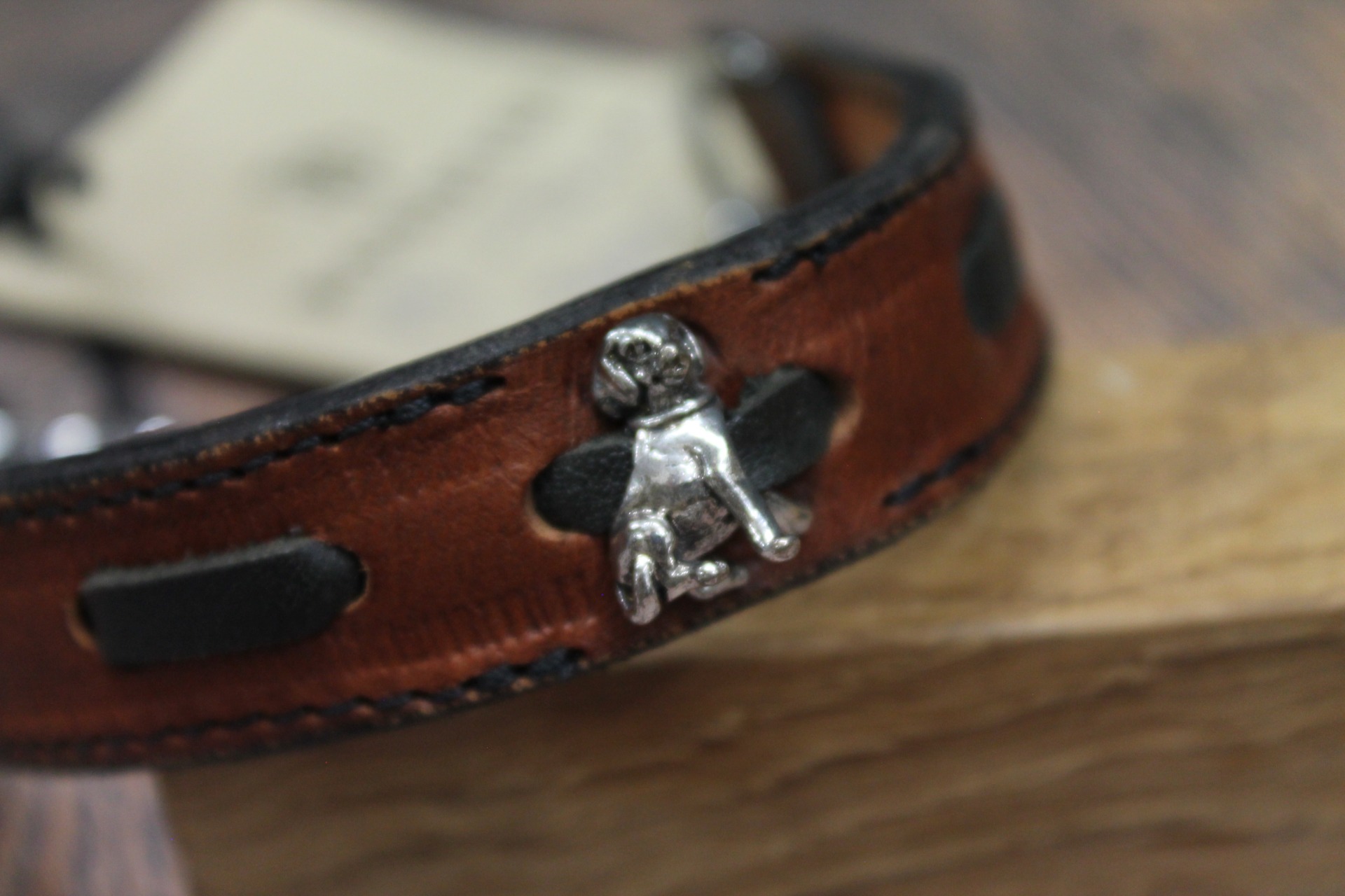Det som gör detta halsband helt unikt är den centrala prydnaden: en detaljerad, sittande hundfigur i silverfinish som blir en vacker symbol för trofasthet. Figuren vilar mot en bakgrund av flätat svart läder som löper genom den bruna basen, vilket ger en spännande kontrast och djup i designen.