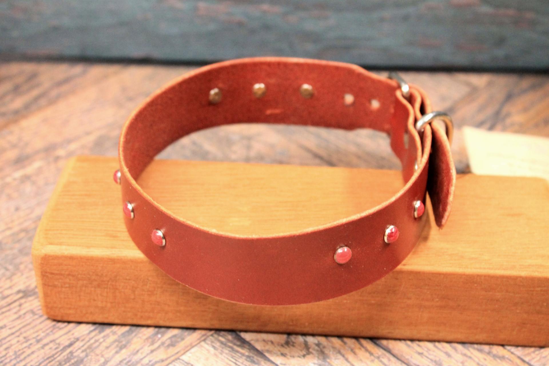Halsbandet präglas av sina infattade nitar i röd marmor. Eftersom marmor är ett naturmaterial har varje sten sitt eget unika mönster av ådringar och färgskiftningar, vilket gör ditt halsband till ett unikt konstverk. De djupröda stenarna mot det rödbruna lädret skapar en harmonisk och "glödande" effekt som påminner om svalnande lava.