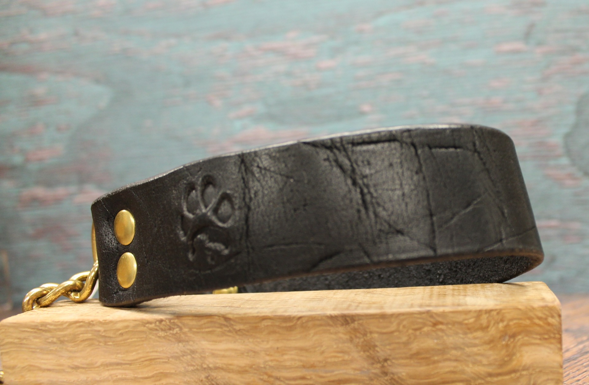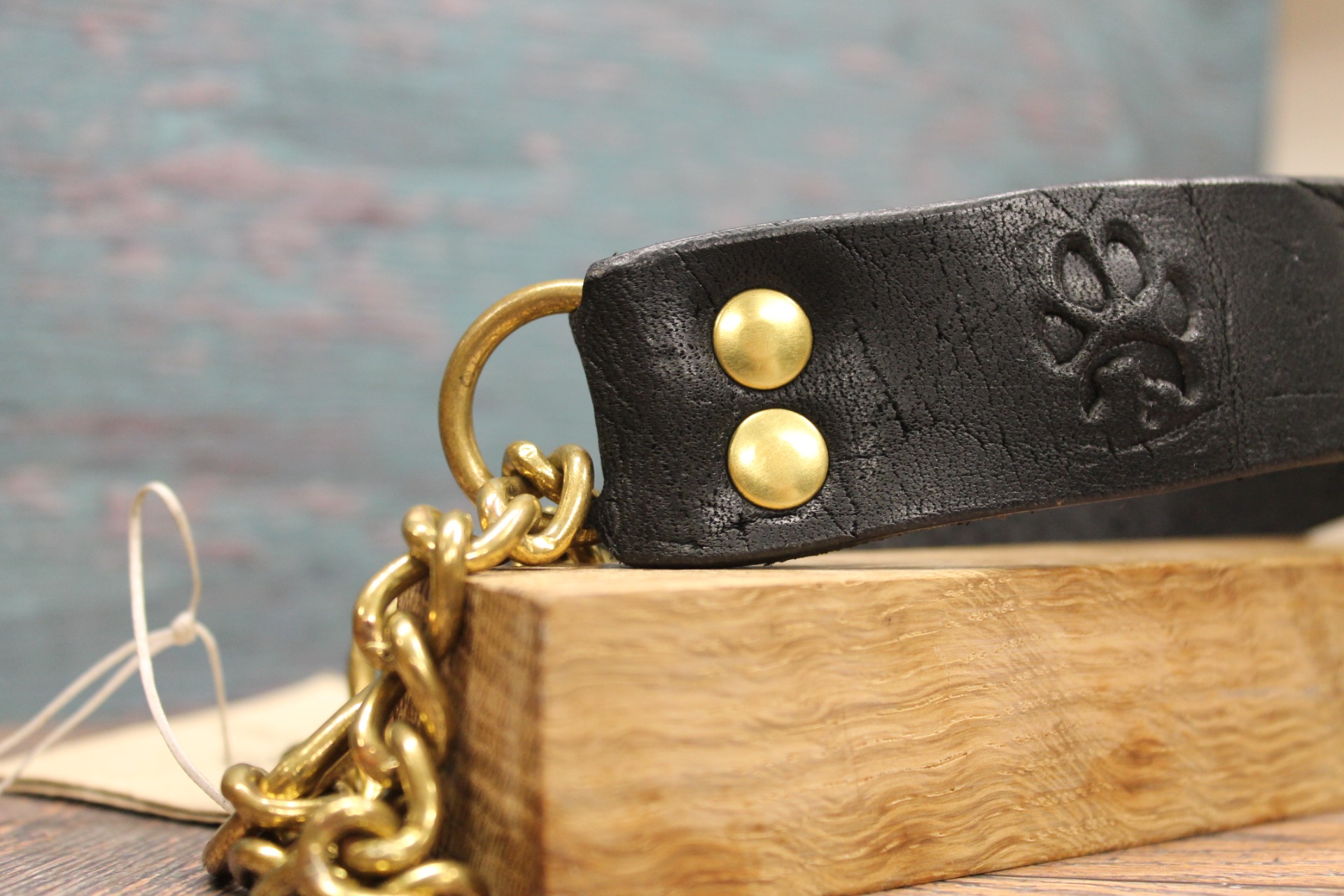 Tillverkat i robust, svart läder med slittåliga detaljer i varm mässing, kombinerar detta halsband klassisk estetik med vardaglig hållbarhet.