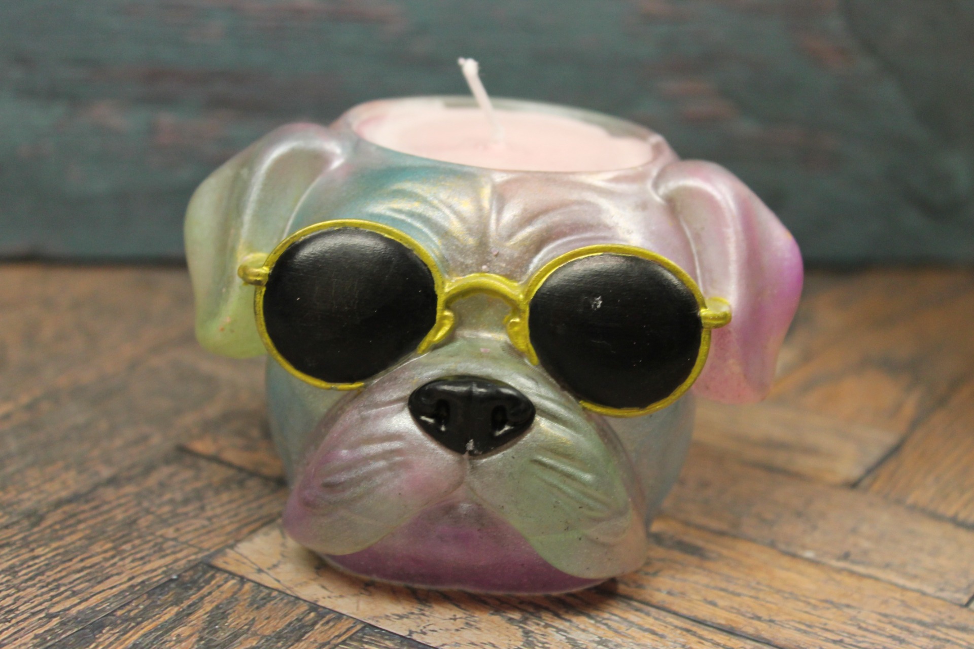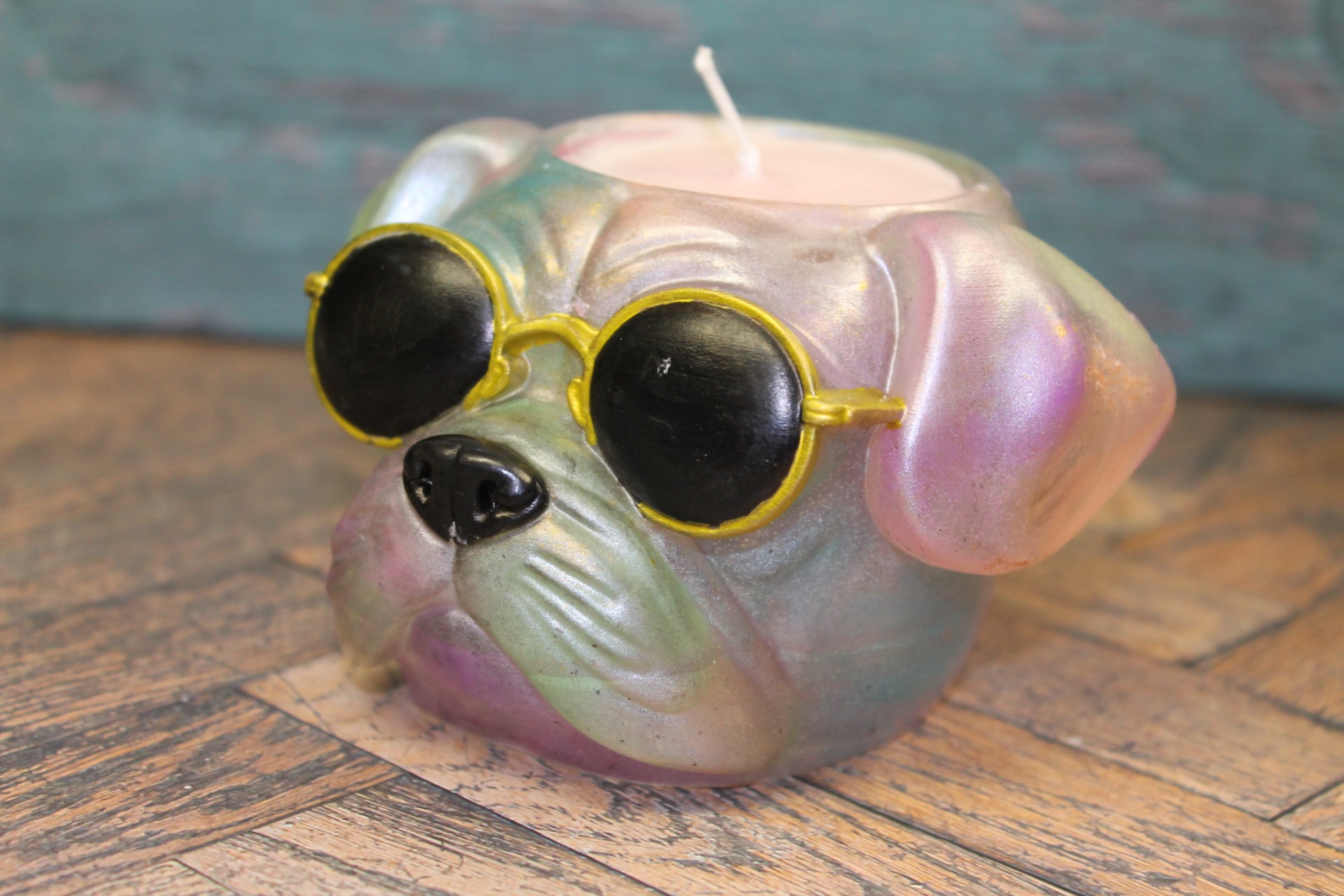 Design & KaraktärLjuset är format som ett bulldogghuvud med ikoniska svarta solglasögon. Ytan är handmålad med en fantastisk pärlemorsfinish som skapar en drömsk "kameleont-effekt". Nyanser av lila, blått, rosa och grönt skiftar magiskt beroende på hur ljuset faller, vilket gör att den drar blickarna till sig i alla rum.