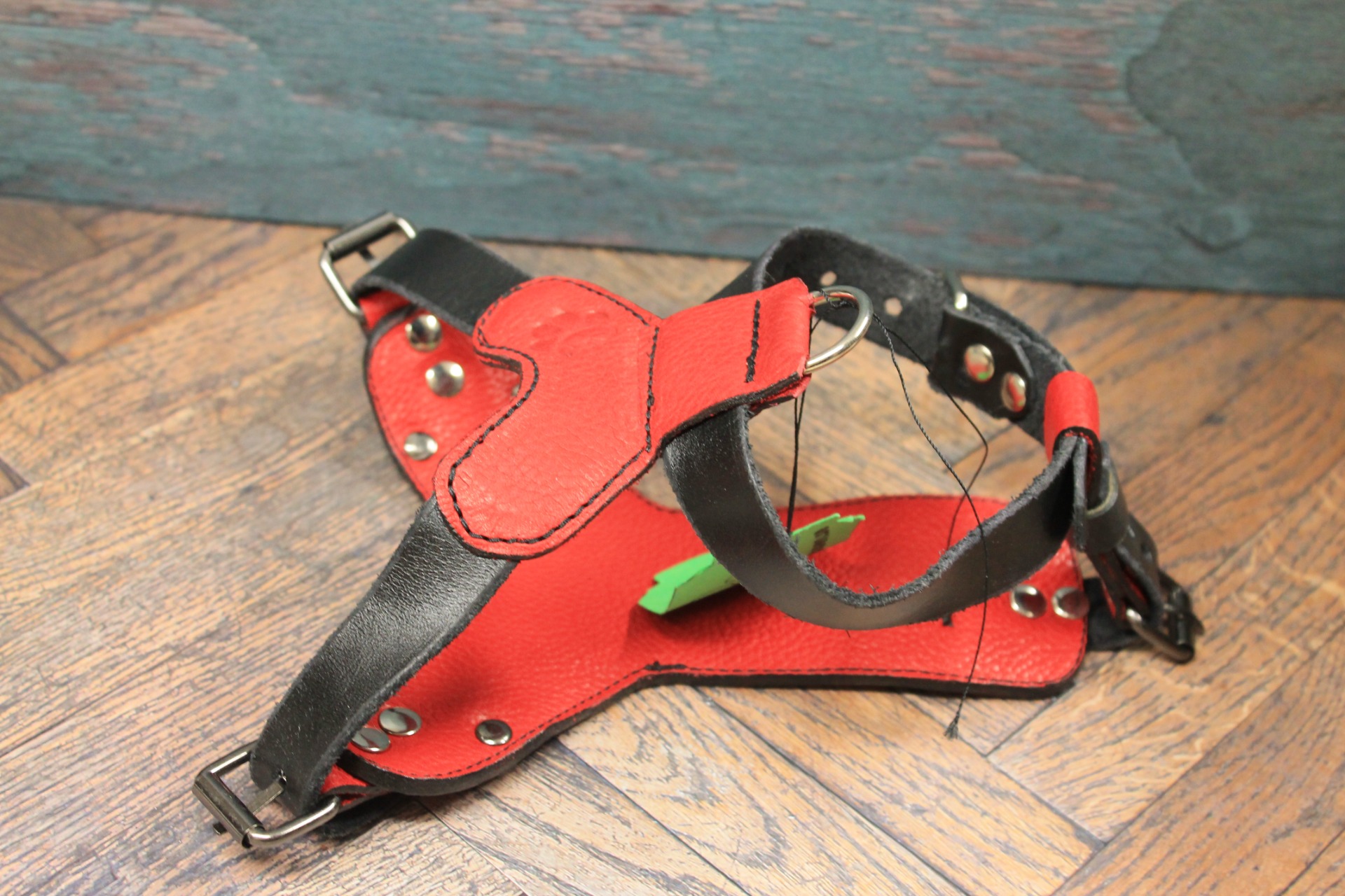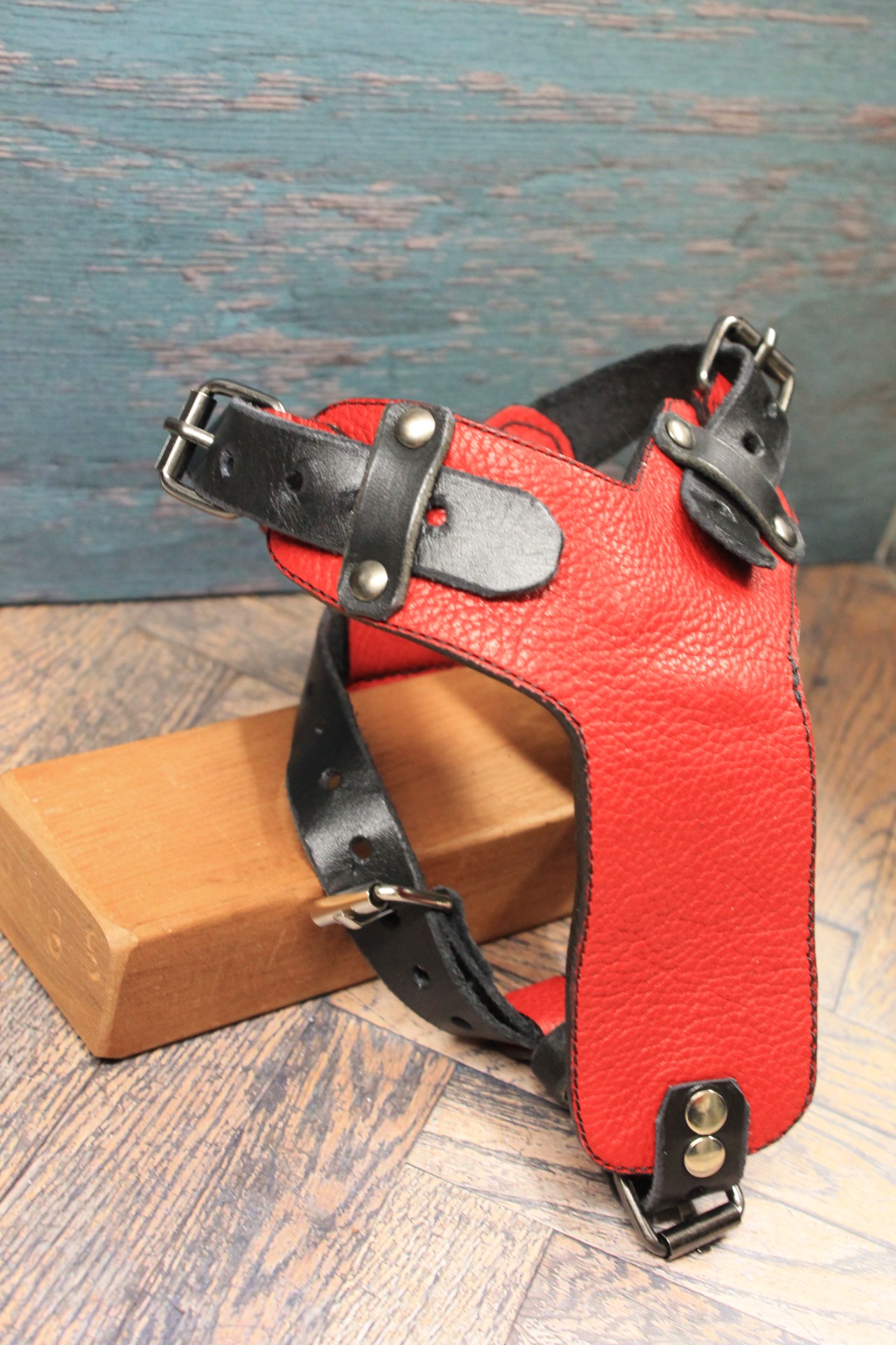 - Hjärtformad bröstplatta: Den centrala delen är formad som ett hjärta i rött läder, vilket ger en personlig och varm touch till den annars tuffa designen.